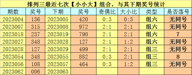大小分析:排列三上期开出号码006,大小类型为【小小大】,最近七次开出大小类型小小大的奖号分别为:136、315、237、348、127、348、108,其下期分别开出号码:420、972、790、127、499、882、464。其中号码大小比为10:11,大小号码开出比例基本相等,本期预计小号转热,关注大小比1:2。