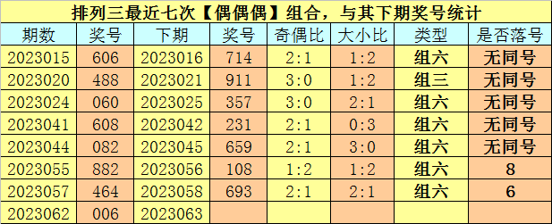 开奖回顾:排列三第2023062期开奖号码为:006。奖号类型为:组三,大小类型为:小小大,奇偶类型为:偶偶偶,无重号。