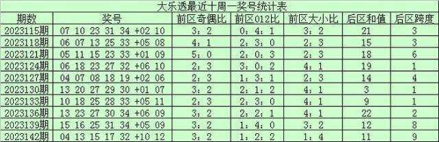 前区奇偶走势:上期前区奇偶比为3:2,上周一前区奇偶比3:2,最近十周一奇数号码表现占优,本期注意偶数号码回补转热,关注奇偶比2:3。