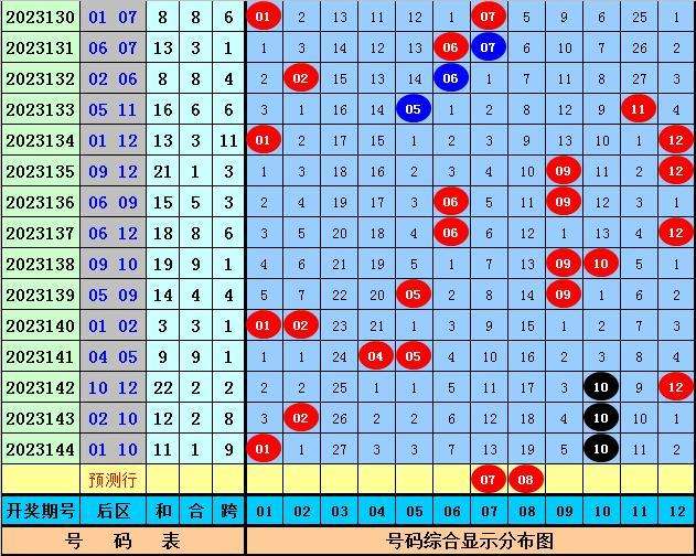 后区分析:上期后区奖号为01+10,开出一大一小组合,上周一后区奖号开出10+12,最近十周一后区奖号大小比为10:10,大小号码走势基本相当,本周一看好大号转热,防全大,参考两码07、08。