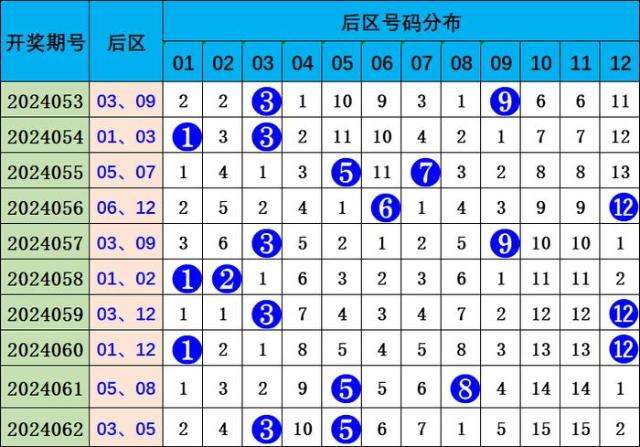 前一区(01-12):上期该区开出1个奖号05,该区最近6期共开出7个前球,表现较冷,本期推荐该区奖号:03、10、12。