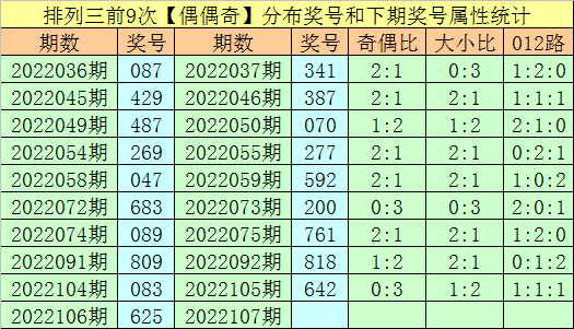 在最近9期开出奇偶分布:偶偶奇的奖号为:087-429-487-269-047-683-089-809-083,在下期出现号码分别为:341-387-070-277-592-200-761-818-642。其中百十个位号码分布情况如下: