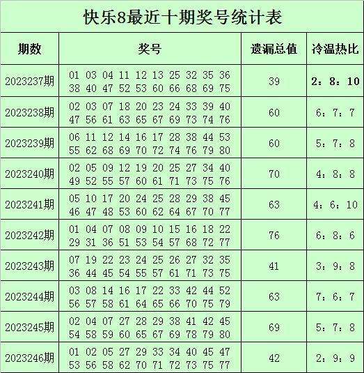 杨光快乐8第2023247期奖号冷温热分析(定义:遗漏0-1期号码为热码,遗漏2-4期号码为温码,遗漏4期以上号码为冷码)