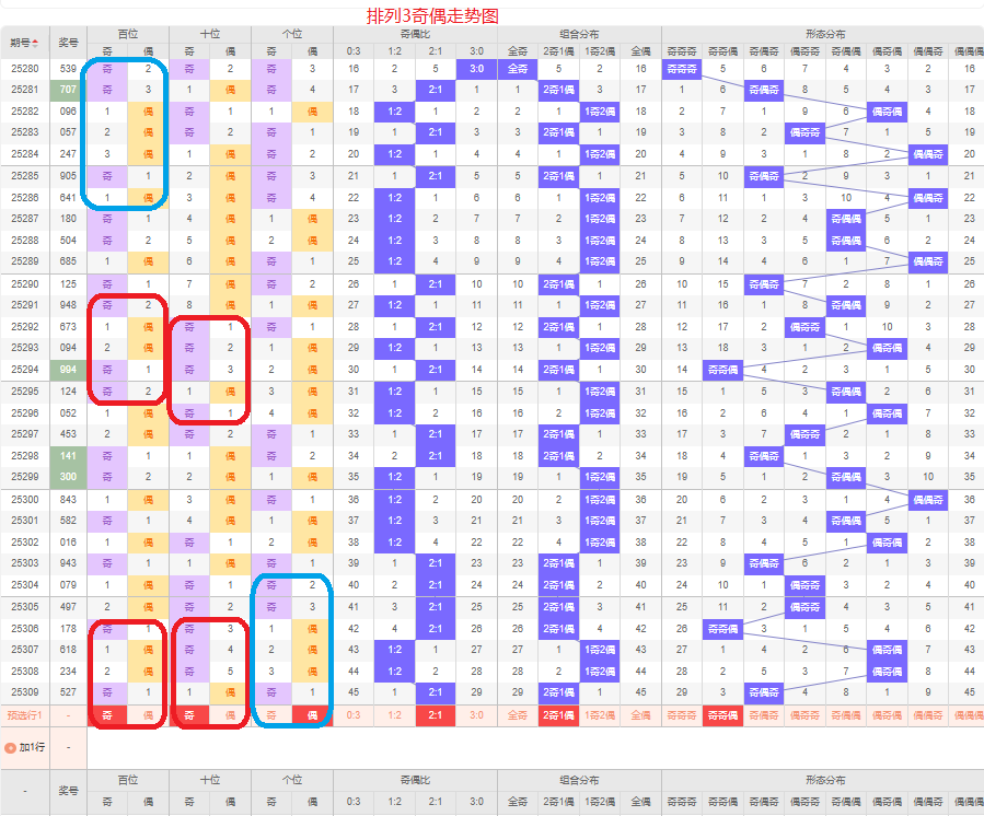 上一期的奇偶比为2:1,两奇的号码组合,从近五期的奇偶数出现情况看,奇数出8次,偶数出现7次,奇数偶数号码出现较平均,本期要侧重两奇的号码组合,侧重奇奇偶或偶奇奇的号码组合,根据奇偶组合形态可做五码定位13579/13579/02468或02468/13579/13579