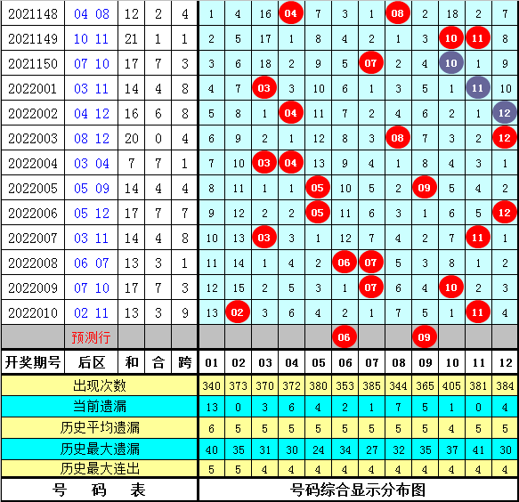 上期后区开出号码:02+11,一大一小组合、一奇一偶组合、全2路组合。本期后区看好一奇一偶组合,关注两码06、09。