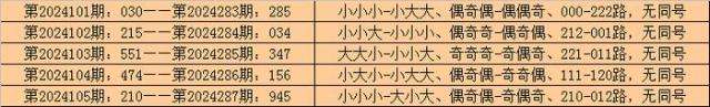 在排列三历史开奖中,第2024101期-第2024105期连续5期奖号为:030-215-551-474-210。
