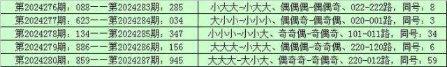 统计排列三已开出的奖号发现,在连续5期(第2024276期-第2024280)奖号为:088-623-134-886-859。
