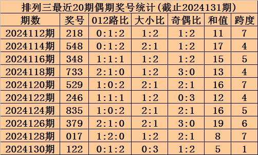 奇偶分析:排列三最近3期奇偶比为1:2、1:2、3:0,奇偶类型开出:偶奇偶、奇偶偶、奇奇奇,本期重点关注偶数号码,防开出全偶组合。