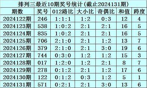 上期回顾:排列三2024131期奖号为571,奇偶比为3:0,大小比为2:1,跨度为13。