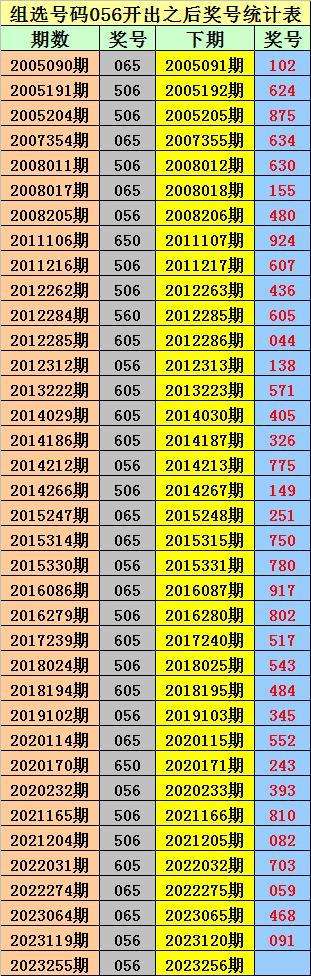 排列三组选056出现之后下期分别开出:102、624、875、634、630、155、480、924、607、436、605、044、138、571、405、326、775、149、251、750、780、917、802、517、543、484、345、552、243、393、810、082、703、059、468、091。