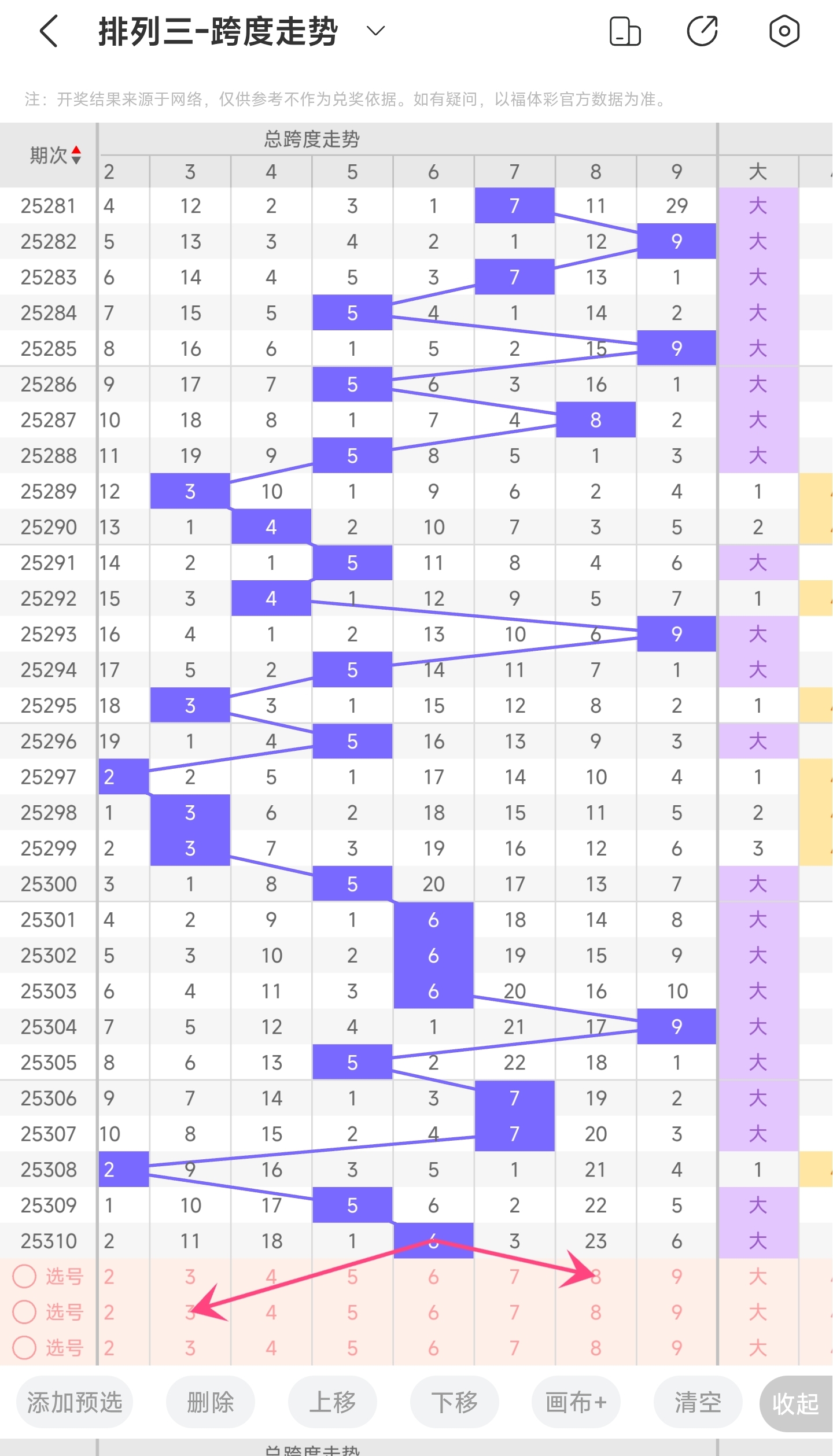上期跨度为6,往前一期跨度是5,趋势往右移动,偏移量为1。跨度值6时,跨度值是近30期内开出中间位置的值。通过走势图分析,目前的趋势是可能往左也可能往右。所以推测本期跨度可能为23579等跨度。