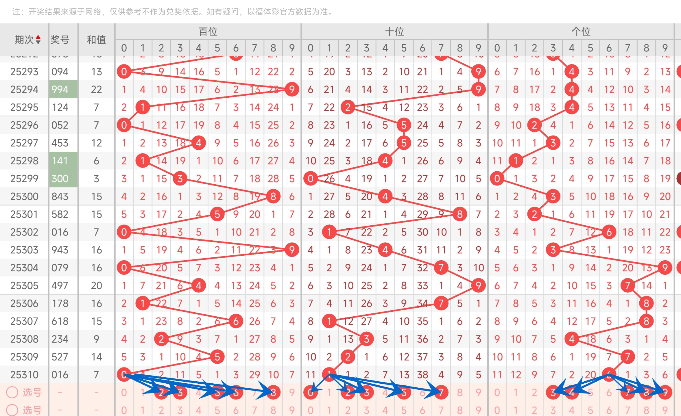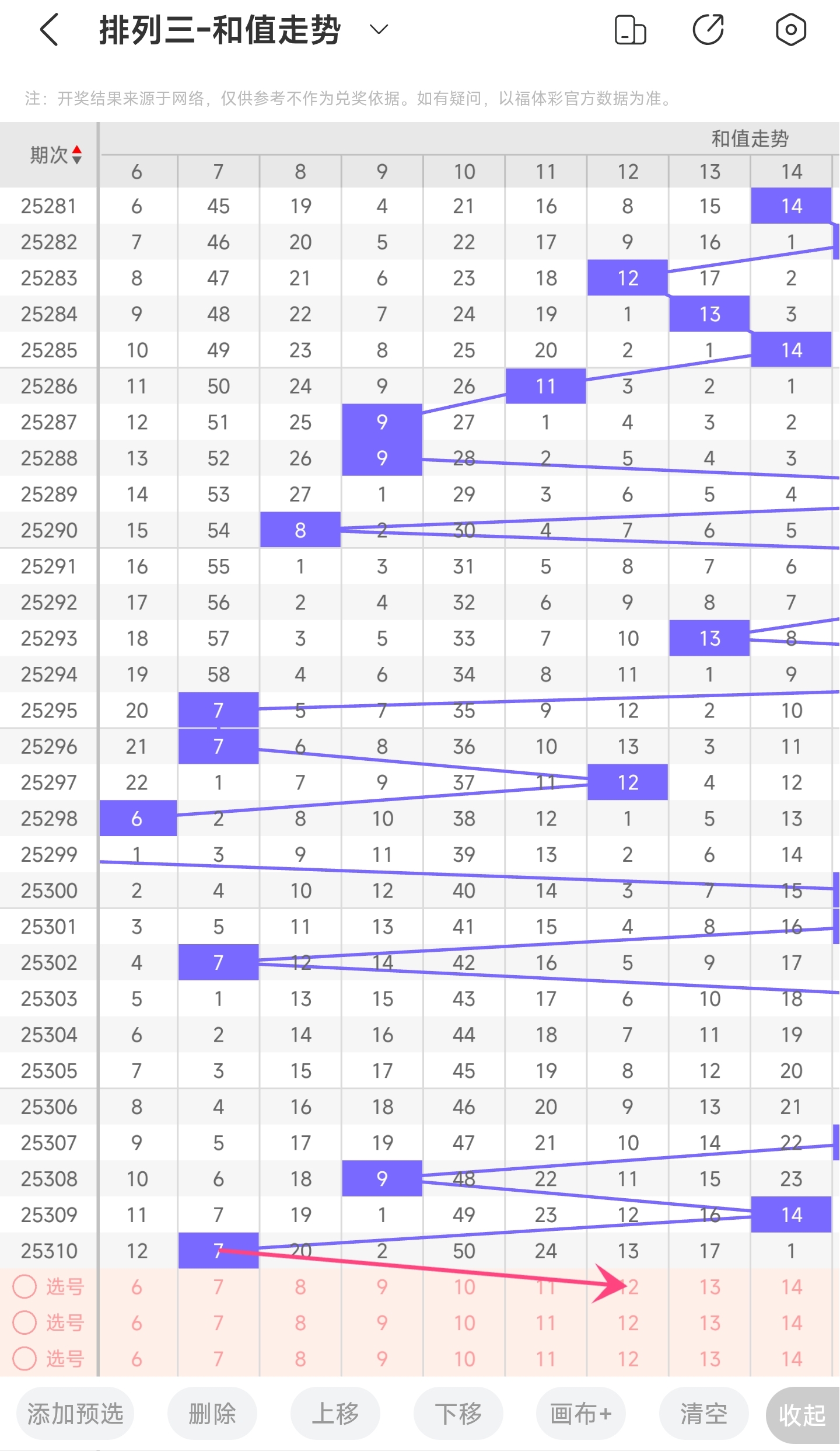 上期和值为7,往前一期和值为14,趋势往左移动,偏移量为7。通过走势图分析,7和值是近30期内开出的比较小的和值,上升空间比较大,下降空间已经很小。所以趋势是也是可能大概率往右的了,小概率继续往左。本期看好大和值,因此推测本期趋势是往右的,和值会变大,小概率往左,和值变小。
