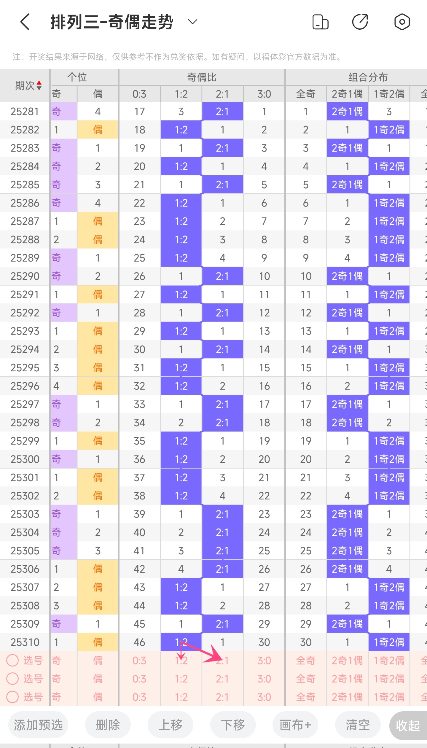 上期开出了1:2的奇偶比。往前一期是2:1奇偶比。通过分析奇偶走势图,近30期内开出1:2奇偶比的次数是17次,开出2:1奇偶比的次数是13次,3:0是0次,0:3是0次。和前一期相比,1:2次数变多,3:0次数变少。通过走势图分析,可以就看到1:2奇偶比最热门,有可能继续开出,但2:1也有可能回补。所以推测本期可能开2:1奇偶比,其次是1:2奇偶比,最后是3:0或者0:3奇偶比。