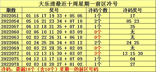 冷号:最近十周星期一前区开出11个冷号,上周星期一冷号出现1个,本周星期一注意冷号32。