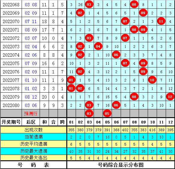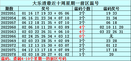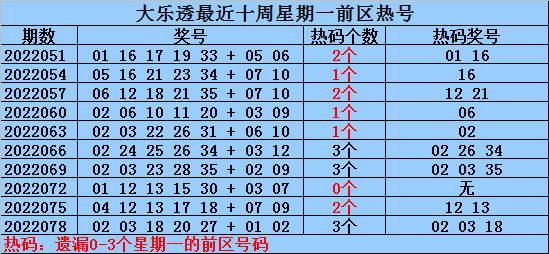热号:最近十周星期一前区开出18个热号,上周星期一前区开出3个热号,本周星期一注意热号01 03。