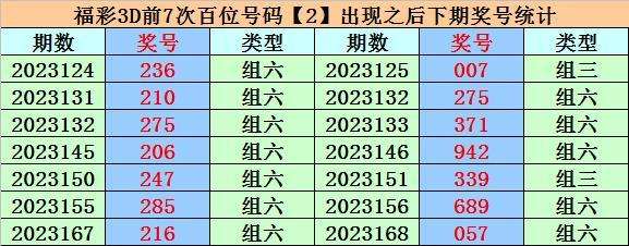 在百位号码2前7次开出之后,其下期分别开出号码:0、2、3、9、3、6、0,其中号码奇偶比为3:4,大小比为2:5,012路比为6:0:1。
