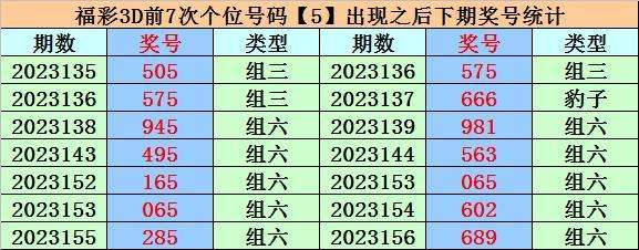 在最近个位奖号中,号码5前7次开出之后,下期分别落号:5、6、1、3、5、2、9,其中奖号奇偶比为5:2,大小比为4:3,012路比为3:1:3。