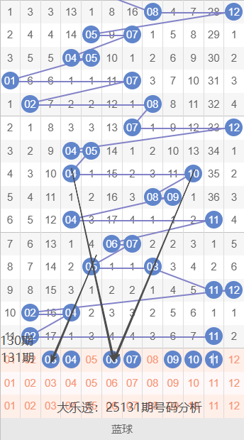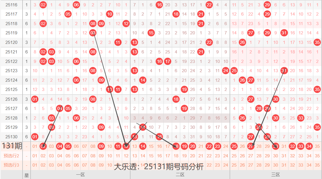 通过上期号码的简单分析,我们看下25131期红色号码球的总体走势,如下图: