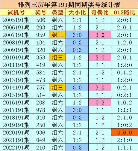 奇偶分析:历史上排列三第191期同期奖号中,奇偶比0:3出现1期,奇偶比3:0出现3期,奇偶比1:2、2:1出现7期,奇偶奖号总比例开出30:24,偶数号码走势较冷,今年第191期适当看好偶数号码回补,预计开出奇偶比1:2。