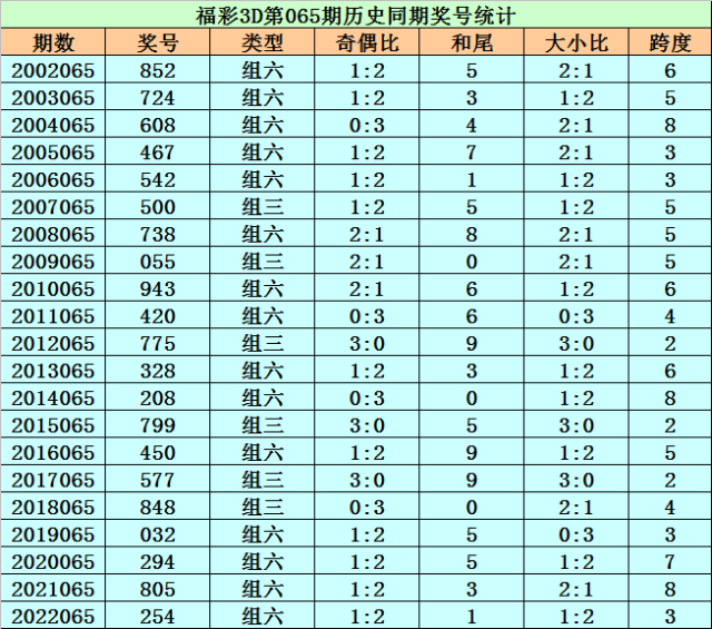 福彩3D历年第065期同期奖号为:852 724 608 467 542 500 738 055 943 420 775 328 208 799 450 577 848 032 294 805 254。