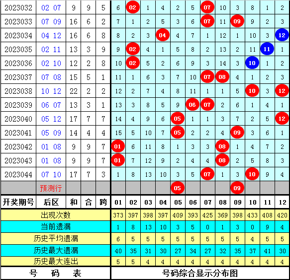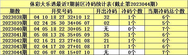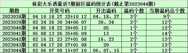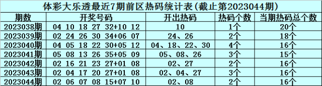 体彩大乐透第2023045期前区冷温热号码分析:(定义:遗漏0-3期号码为热码,遗漏4-9期号码为温码,遗漏9期以上号码为冷码)