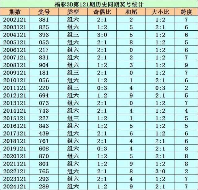 福彩3D历年第121期同期奖号为:381 825 393 053 217 831 904 181 056 220 694 073 743 227 843 439 761 608 870 801 765 293 289。