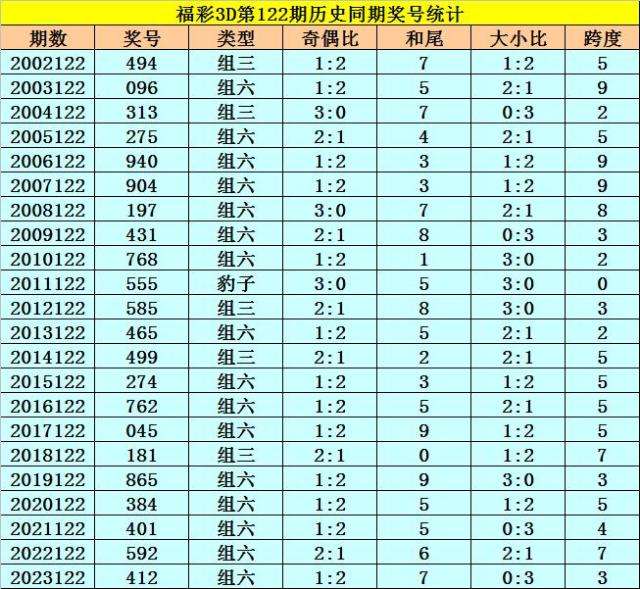 福彩3D历年第122期同期奖号为:494 096 313 275 940 904 197 431 768 555 585 465 499 274 762 045 181 865 384 401 592 412。