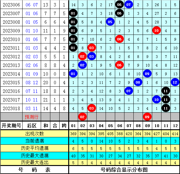 上期后区开出号码:03+11,1路号断档、一大一小组合、全奇组合。本期后区防1路号断档,两码看好02、09。