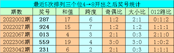 1、排列三前两期个位分别开出号码4和8,历史上个位号码连续两期分别出现4和8时,共有55次。在最近5次出现时,其下期分别出现号码:287、924、013、559、231;