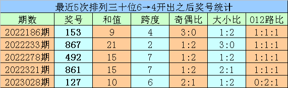 1、最近两期排列三十位号码开出号码分别为6和4,历史上十位号码连续两期同时出现号码6和4的奖号共开出65期。最近五次下期开出号码为:153、867、492、861、127;