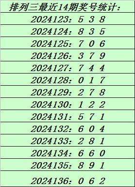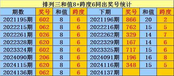 上期回顾:排列三第2024136期奖号:062。和值8,跨度6。