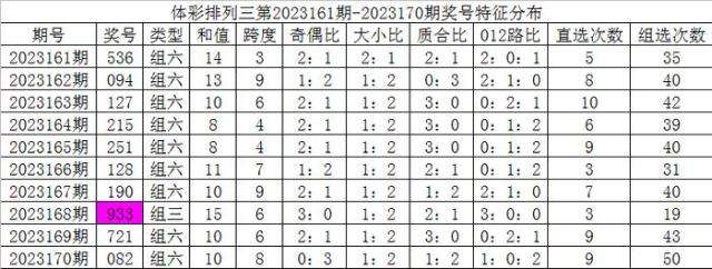 开奖公告:体彩排列三第2023170期开出奖号:082。组六,有重号:2,奇偶比0:3,大小比1:2,012比1:0:2,和值10,跨度8。