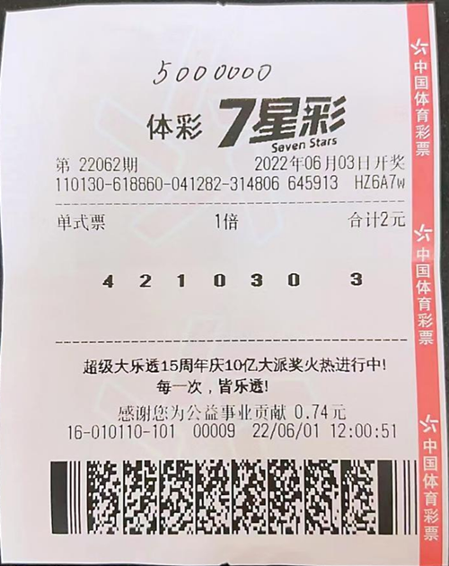 6月3日,体彩7星彩第22062期开奖,号码为:4 2 1 0 3 0 + 3,当期开出一等奖2注,其中一注花落河北石家庄,单注奖金达到500万元。6月6上午,中奖的幸运儿在亲友的陪同下,来到省体彩中心兑奖。