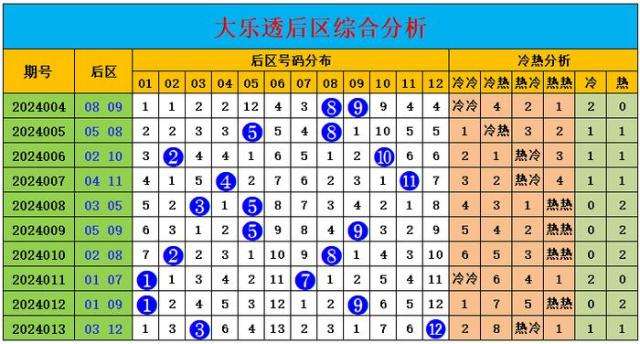 上期后区开出号码03、12,为热热组合。最近10期后区冷热比8:12,热码整体走势稍热,最近10期后区冷冷组合开出2期,冷热组合开出1期,热冷组合开出3期,热热组合开出4期。