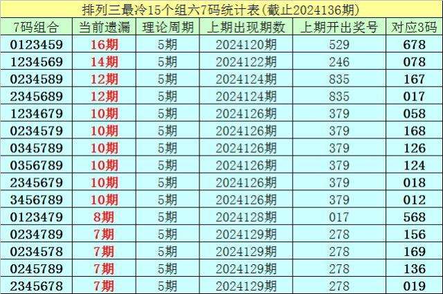 (1)在排列三已开出的6908期奖号中(统计截止第2024136期),目前7码组六遗漏值最大的组合为:0123459,本期遗漏16期;