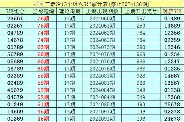 (4)排列三第2024136期遗漏值最大的十个5码组六组合解冻了0个;