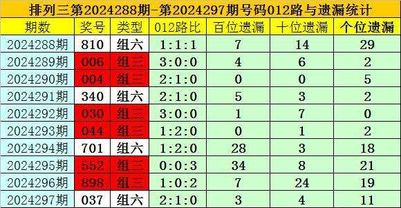 开奖回顾:排列三第2024297期奖号为:037,类型为组六,号码012路比为2:1:0,百十个位号码直选分别遗漏3期、4期和11期。
