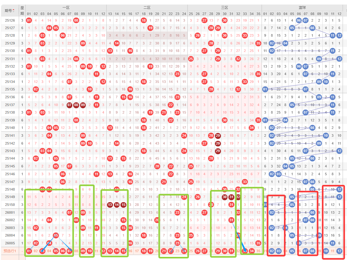 先回顾上期,特征:奇偶比2:3,区间比是2:2:1,质合比为2:3,1个红球重号,0组连号,0个邻号,4个孤号,蓝球小大组合,偶数奇数组合。