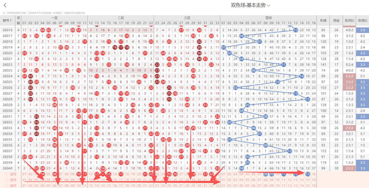 上期开奖号 码为:03 04 14 22 23 33 04 区间222 和值99 跨度30 奇偶比3:3