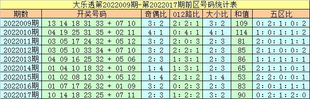 上期回顾:大乐透第2022017期奖号为:10 14 18 23 25 + 07 11,其中前区奇偶比2:3,012路比1:2:2,大小比3:2,和值90,五区比0:2:1:2:0。
