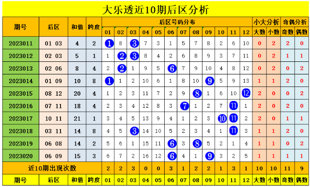 后区近10期大小比为10:10,大、小号码走势较热,上期开出小大组合,本期后区推荐小小组合;