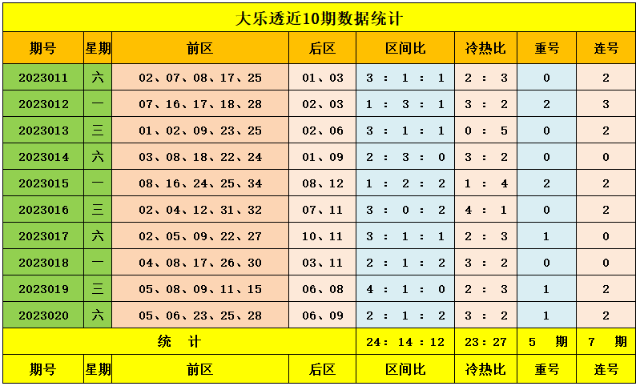 上期回顾:大乐透第2023020期奖号为:前区05、06、23、25、28,后区06、09。前区奖号三区比为2:1:2,开出1重号05,开出1组连号05、06。后区开出小大组合06、09