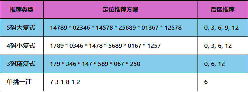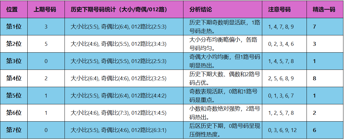 本期012路推荐比例:2:3:1,重点关注1路号码,兼顾0路。
