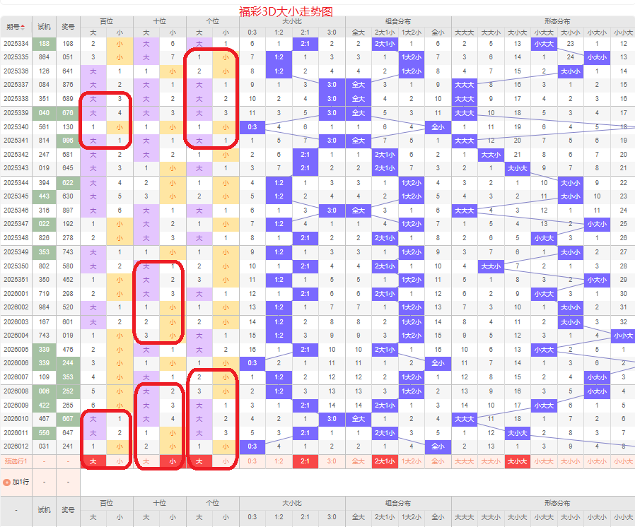 上期大小比为0:3,全小的号码组合方式,从近五期出现情况看,大号码出现8次,小号码出现7次,大小号码出现较平均,本期侧重两大的号码组合,本期百位侧重大号码,十位侧重小号码,个位要侧重看大,侧重大小大或者小小大的号码组合,根据大小做五码定位56789/01234/56789或01234/01234/56789