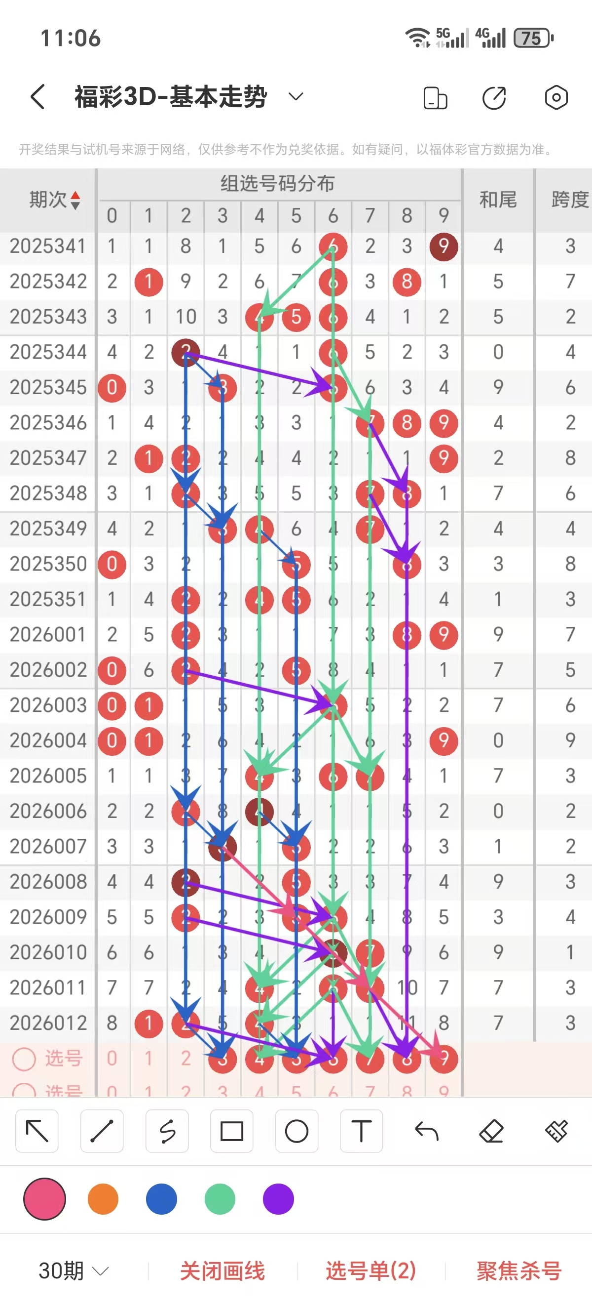 跨度通常情况下在五期之内重复一个跨度的概率很高,近五期重复了3的跨度,近五期跨度为3/4/1/3/3,近期01路的跨度较热,上期是0路的跨度,本期要侧重跨度以3/5跨为主的号码组合。可以从跨度方面选择相应的双胆码组合,双胆码的选取要根据近期和历史的走势进一步的分析选取。