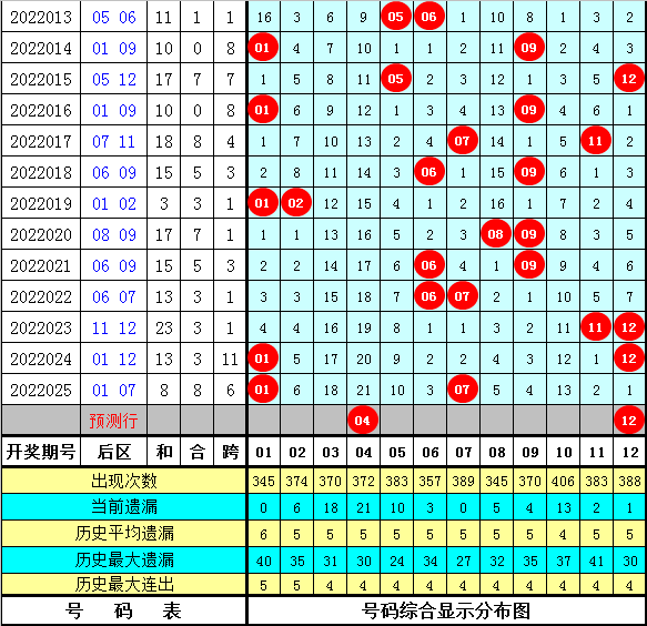后区分析:上期后区奖号为01+07,本期后区排除重号,四码参考03、04、06、12。
