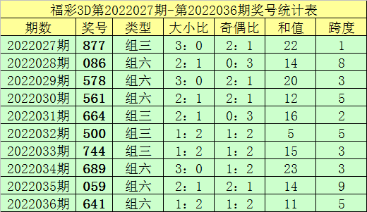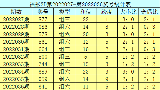 开奖回顾:福彩3D第2022036期奖号为:641。奖号形态开出组六,奇偶比开出1:2,012路比为1:2:0,大小比为1:2。