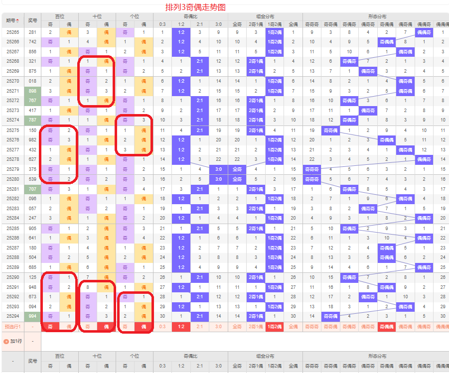 上一期的奇偶比为2:1,两奇的号码组合,从近五期的奇偶数出现情况看,奇数出8次,偶数出现7次,奇数偶数号码出现较平均,本期要侧重两偶的号码组合,侧重奇偶偶或奇奇偶的号码组合,根据奇偶组合形态可做五码定位13579/02468/02468或13579/13579/02468