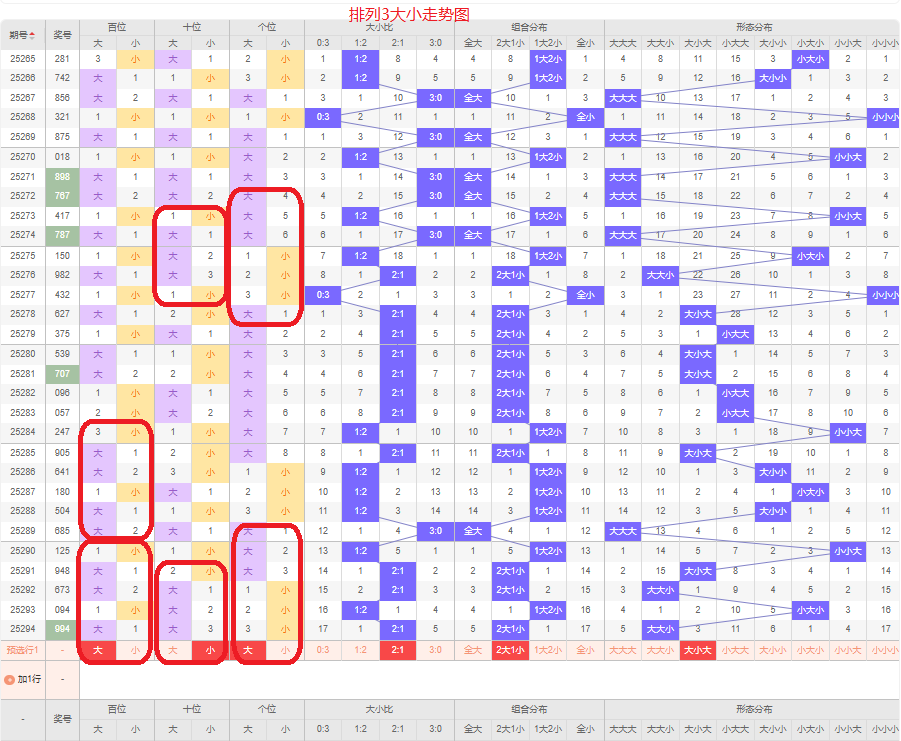 上一期大小比为2:1,两大的号码组合,近五期大号出8次,小号出7次,大小号码出现较平均,上一期是两大的号码组合,本期侧重两大的号码组合,百位本期侧重的大号码,十位本期侧重小号码,个位侧重大号码,侧重小大小或者小小大的号码组合,根据大小形态五码定位56789/01234/56789或者01234/01234/56789