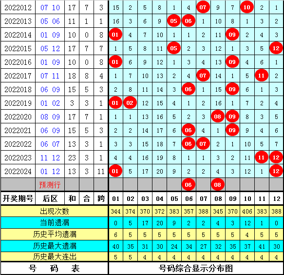 后区奇偶比1:1,后区大小比1:1,后区和值为13,后区跨度为11,与上期有1个同号:12。